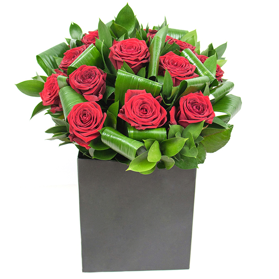 Elevate your home’s style with our sophisticated bouquet featuring luxurious red roses, vibrant aspidistra leaves, and elegant ruscus. This unique arrangement offers both beauty and grace.